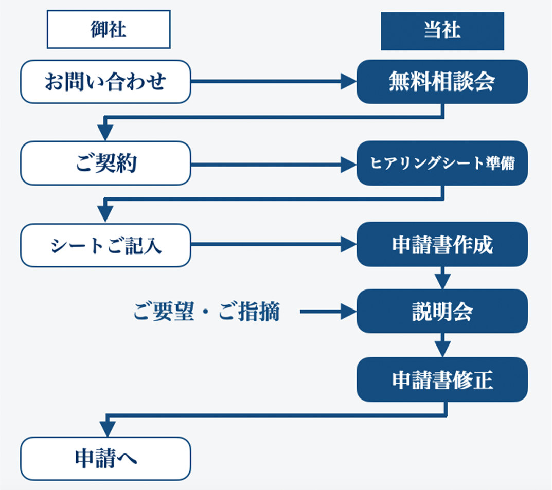①初回相談 → ②ヒアリング → ③申請書草案作成 → ④企業様確認・修正 → ⑤最終提出、という流れです。通常1〜2か月程度の準備期間を要します。